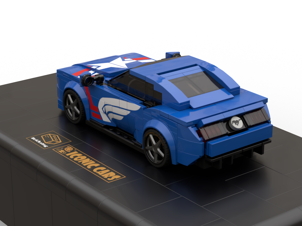 Bring American muscle and comic book charm to your collection with this uniquely designed brick model, inspired by the legendary F-Mustang – combined with a heroic C-America color scheme . With its aggressive stance , bold lines , and striking two-tone blue and turquoise design, this model blends classic car culture with superhero-inspired styling.